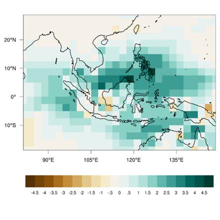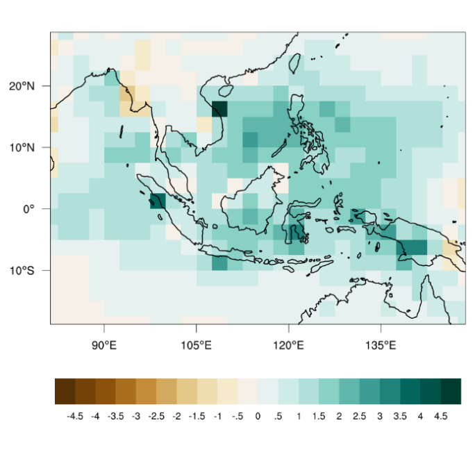 The image above shows the precipitation anomalies averaged over the El Niño and La Niña years. For instance, the impact of El Niño is typically stronger over the southern and eastern part of South East Asia during the months of Jun – Oct.