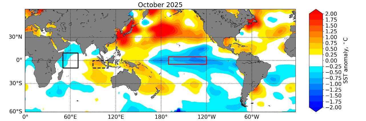 The sea surface temperatures (SSTs) over the tropical Pacific in October 2025 were below average in the central and eastern portions of the region and above average in the west, indicative of La Niña conditions (Figure 1). The coolest (negative) anomalies in the Nino3.4 region (red box). Across the Indian Ocean, the equatorial region was above average in the eastern parts of the region (including the dashed black box) and below to near-average in the west. This dipole pattern is indicative of a negative IOD.