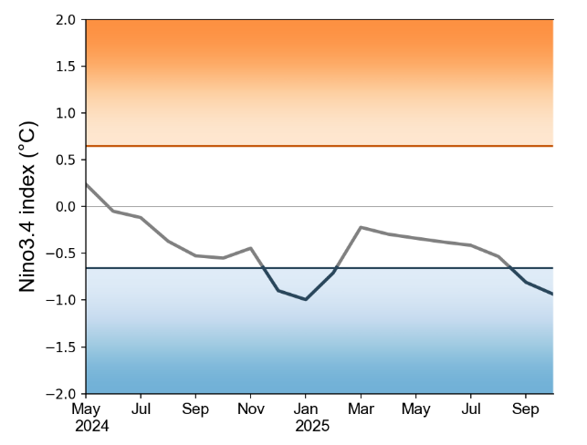The El Niño Southern Oscillation (ENSO) monitoring system state is “La Niña Conditions”. The oceanic indicators, including the Nino3.4 index, show the presence of La Niña conditions. Key atmospheric indicators (cloudiness and trade winds in the central Pacific) support La Niña conditions. The Nino3.4 index was -0.94°C for September 2025 and -0.78°C for the August – October 2025 three-month average.