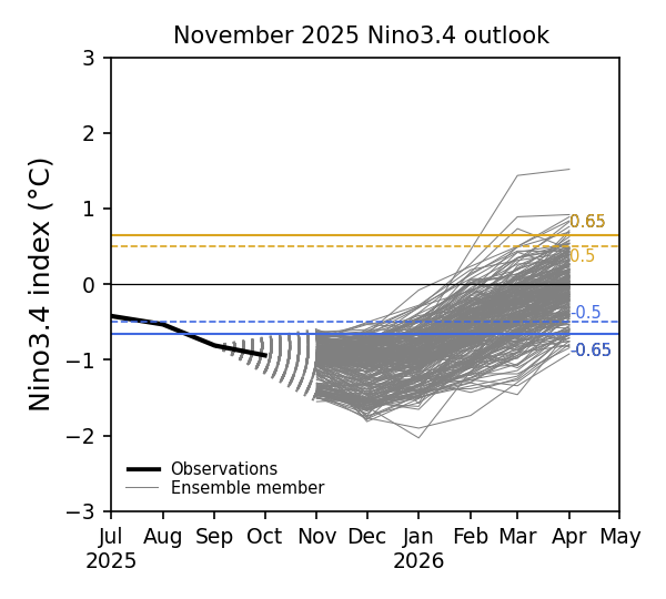 Weak to moderate La Niña conditions are predicted for November 2025 – January 2026, with some models predicting the La Nina conditions to continue into February – March 2026.