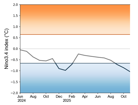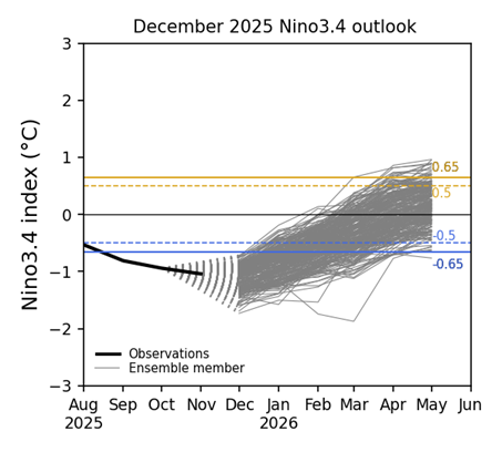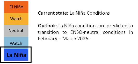 La Niña conditions are predicted persist until January 2026, with models predicting a transition to ENSO-neutral conditions in February – March 2026.