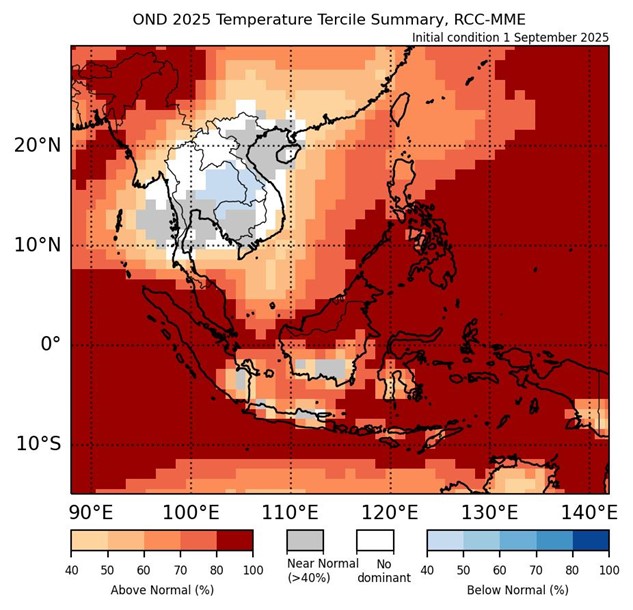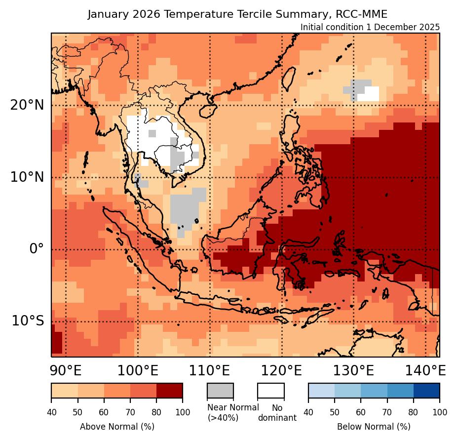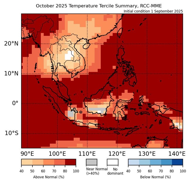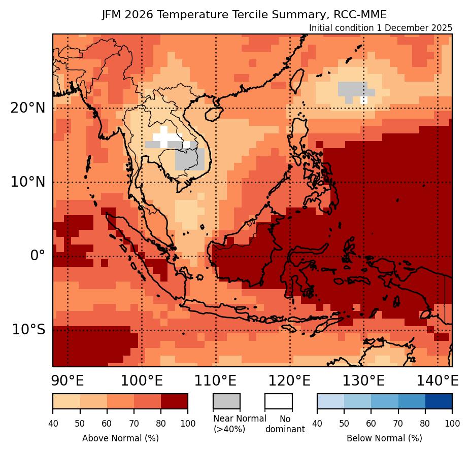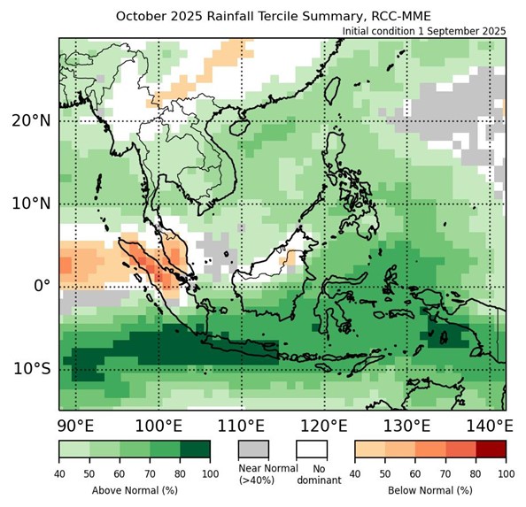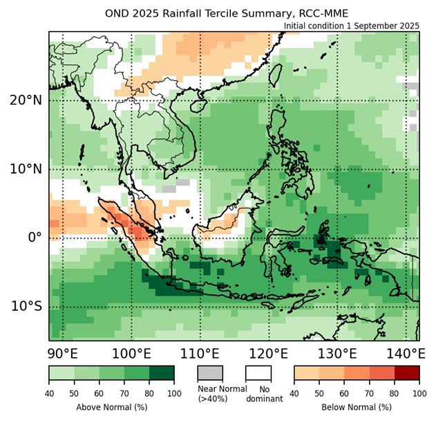 Example of probabilistic long range forecast using the multi-model ensemble. For areas nearby Peninsular Malaysia, the forecast is showing a probability of 50-70% of rainfall being in the below-normal (33%) tercile range. (Source: WMO LC LRF)