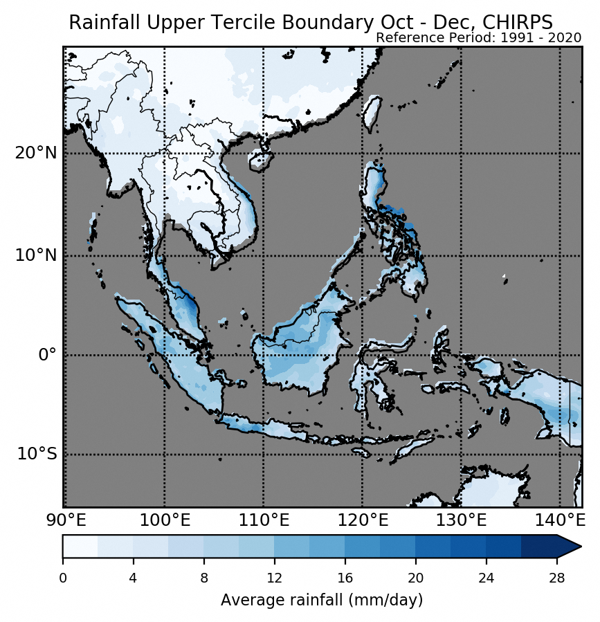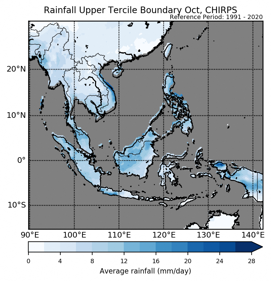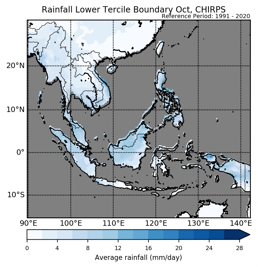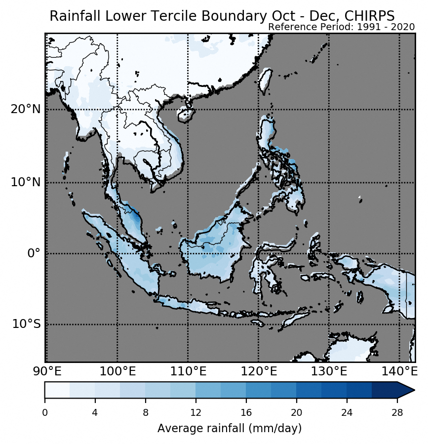 Example of probabilistic long range forecast using the multi-model ensemble. For areas nearby Peninsular Malaysia, the forecast is showing a probability of 50-70% of rainfall being in the below-normal (33%) tercile range. (Source: WMO LC LRF)