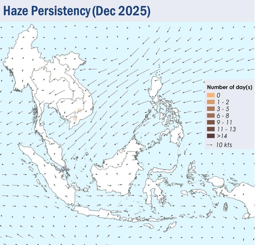 1.1 In December 2025, Northeast monsoon was well established over the ASEAN region as the prevailing low-level winds over most areas north of the Equator blew from the northeast or east except for the northern parts of the Mekong sub-region where the prevailing low-level winds were light and variable in direction. Over the areas south of the Equator, the prevailing low-level winds blew mainly from the west and northwest. (Figure 1).