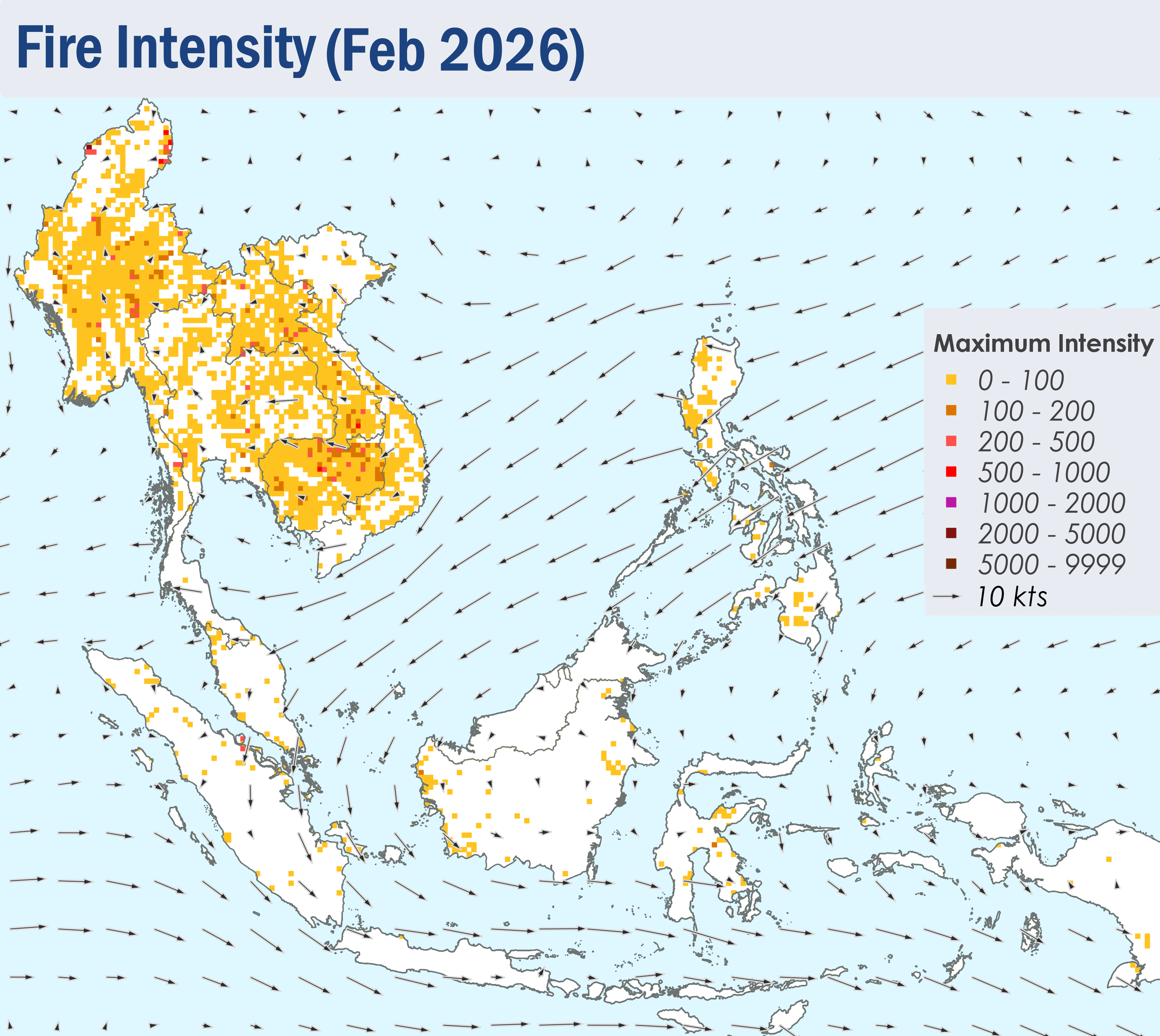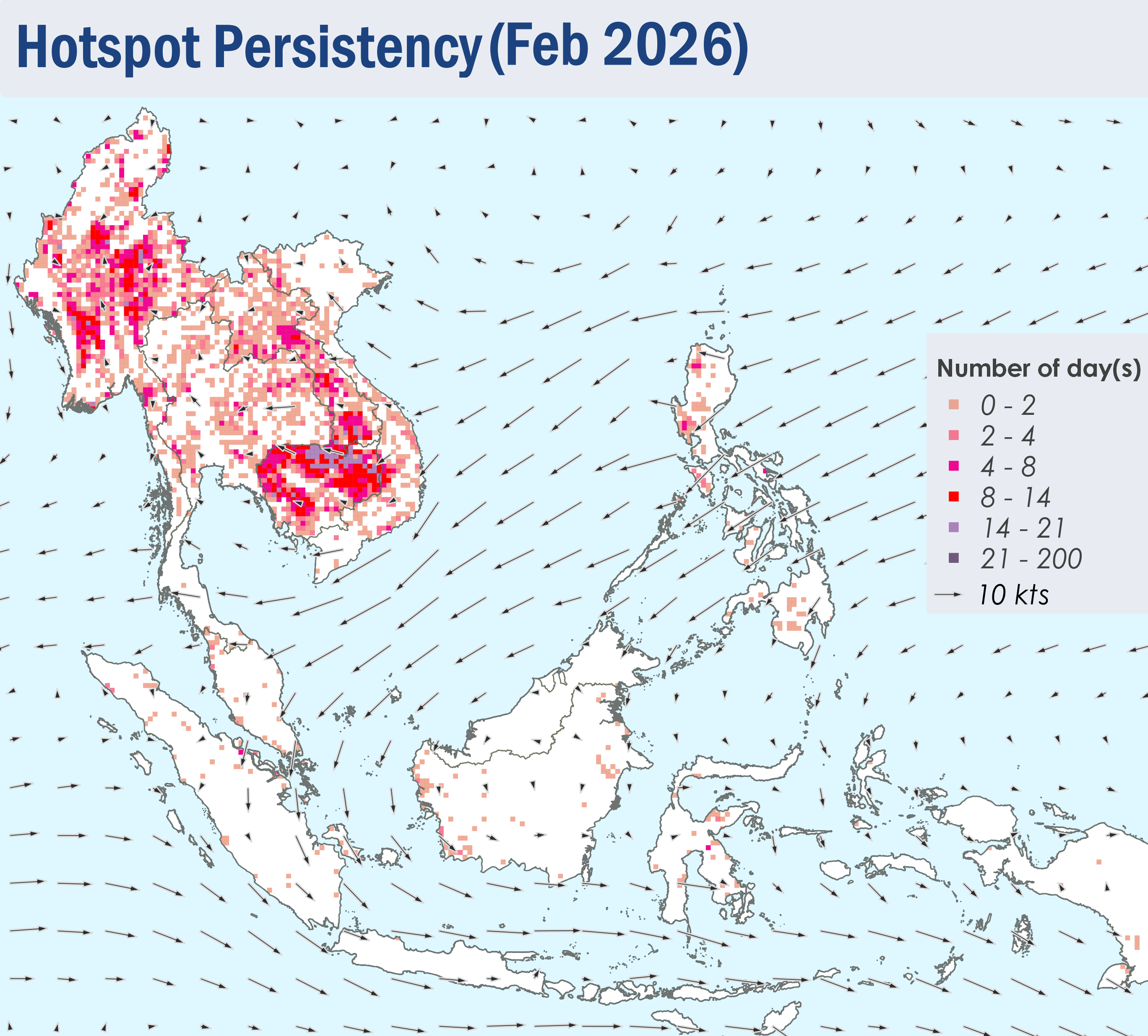 1.4 Scattered to widespread hotspots were often observed over the northern and western parts of Cambodia as well as the southern parts of Lao PDR (Figure 4), leading to moderate to dense smoke plumes observed over these areas for many days during February 2026 (Figure 6). Transboundary smoke haze would occasionally occur from the southern parts of Lao PDR to the northern parts of Cambodia, as well as from the western parts of Cambodia to the central parts of Thailand (Figure 8 & 9) . Moderate to dense smoke haze was observed to persist over the central and northern parts of Myanmar under the prevailing light winds situation (Figure 6 and 9 ). In the southern ASEAN region, Smoke plumes were also observed in the southern parts of Peninsular Malaysia, the central parts of Sumatra and in West Kalimantan for a few days in the month. (Figure 6 and 7 )