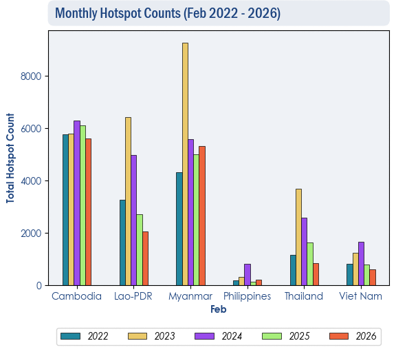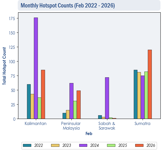 1.3 Despite the drier conditions, hotspot counts over the ASEAN region for February 2026 were observed to be much lower or comparable compared to the hotspot counts from the preceding years (2022-2025), except for Sumatra where hotspot counts were higher.