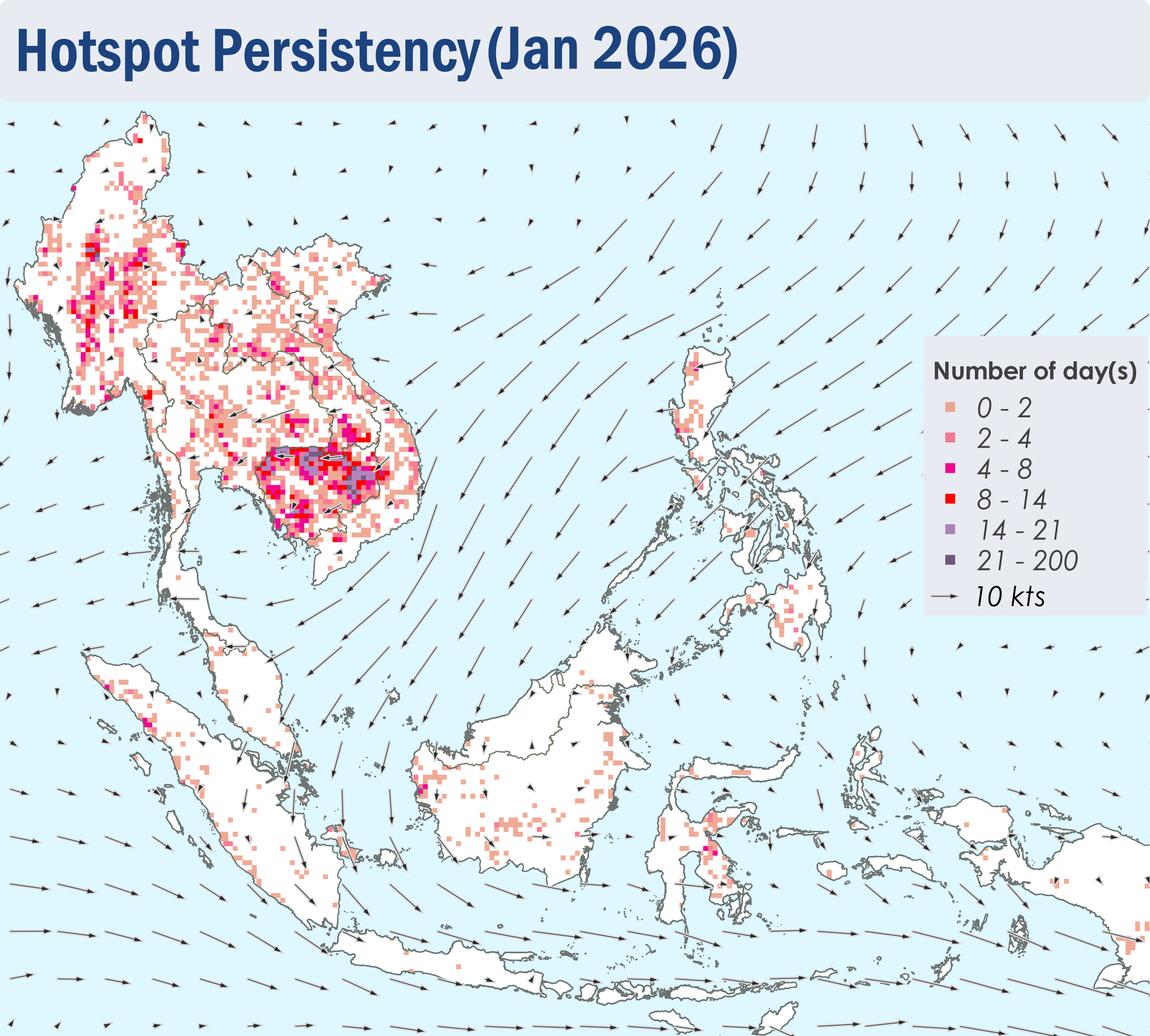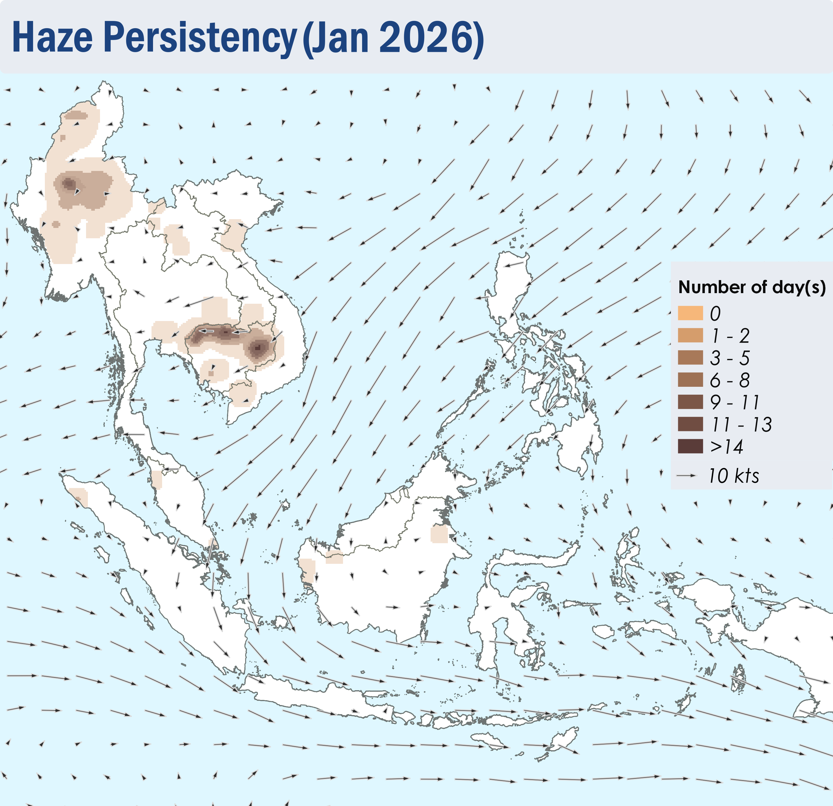1.1 The Northeast Monsoon continued over the ASEAN region throughout January 2026. The prevailing low-level winds over regions north of the Equator blew mainly from the northeast to east, except over the northern parts of the Mekong sub-region where the winds were light and variable in direction (Figure 1). Over regions south of the Equator, the prevailing low-level winds blew mainly from the west to north (Figure 1).