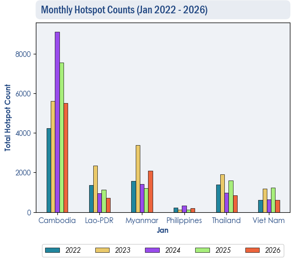 1.4 Persistent and intense hotspots were detected mostly in Cambodia, Myanmar and the southern parts of Lao PDR (Figures 4 and 5). During prolonged periods of dry weather, moderate and persistent smoke plumes were observed mainly over the central parts of Myanmar and the northern parts of Cambodia. Smoke plumes were also observed over the other parts of the Mekong sub-region, Sumatra, Peninsular Malaysia and Kalimantan (Figures 6 to 10).