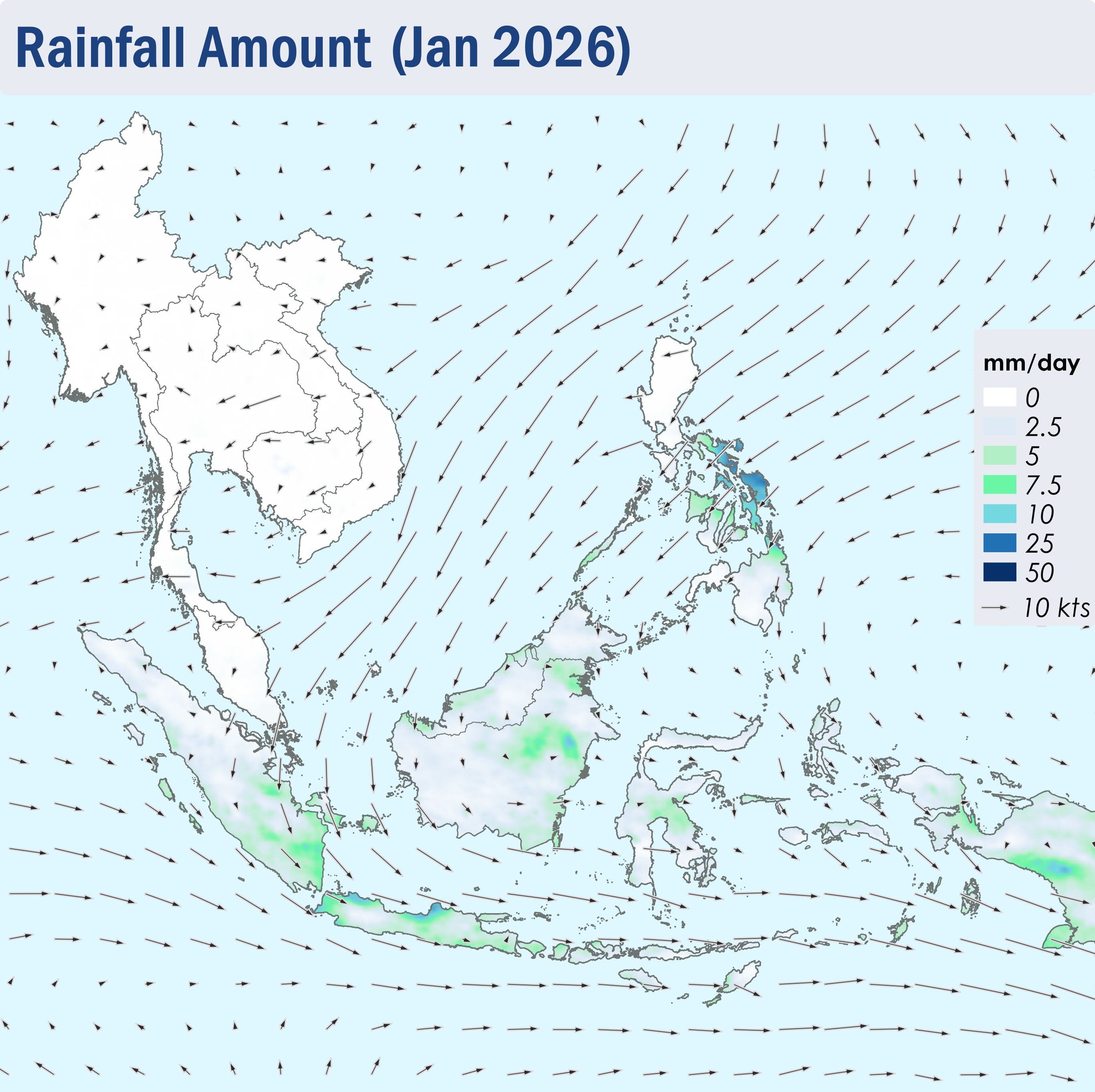 1.2 Dry weather persisted over the Mekong sub-region, Peninsular Malaysia and the northern parts of the Philippines in January 2026. Showers were observed elsewhere in the ASEAN region (Figure 1), with the areas south of the Equator, the eastern parts of Borneo and the central parts of the Philippines experiencing higher rainfall. The latter was due to the influence of Tropical Storm NOKAEN.