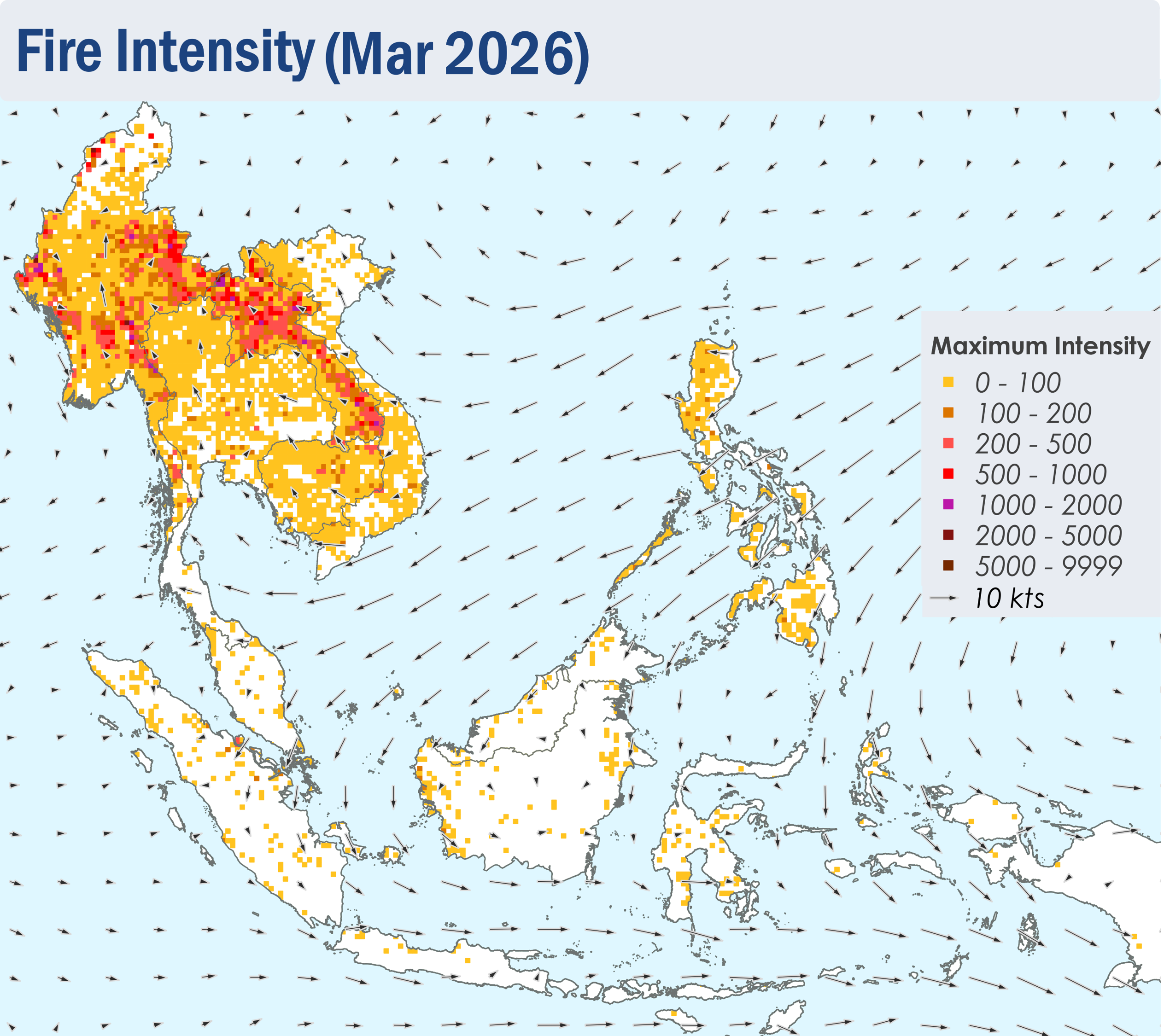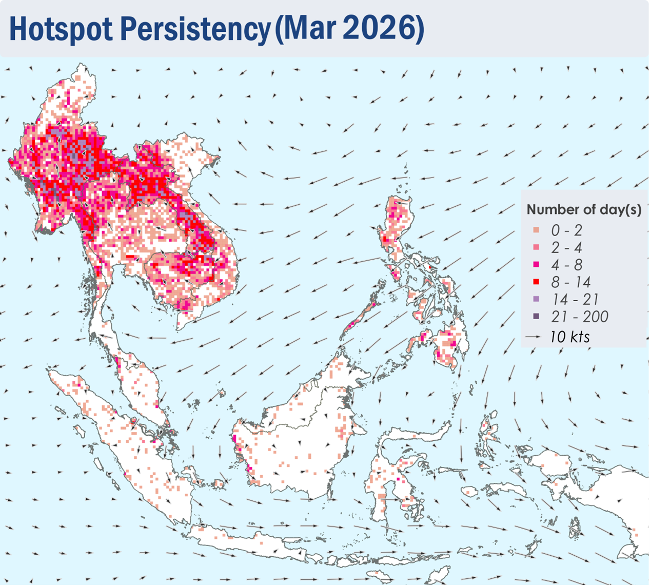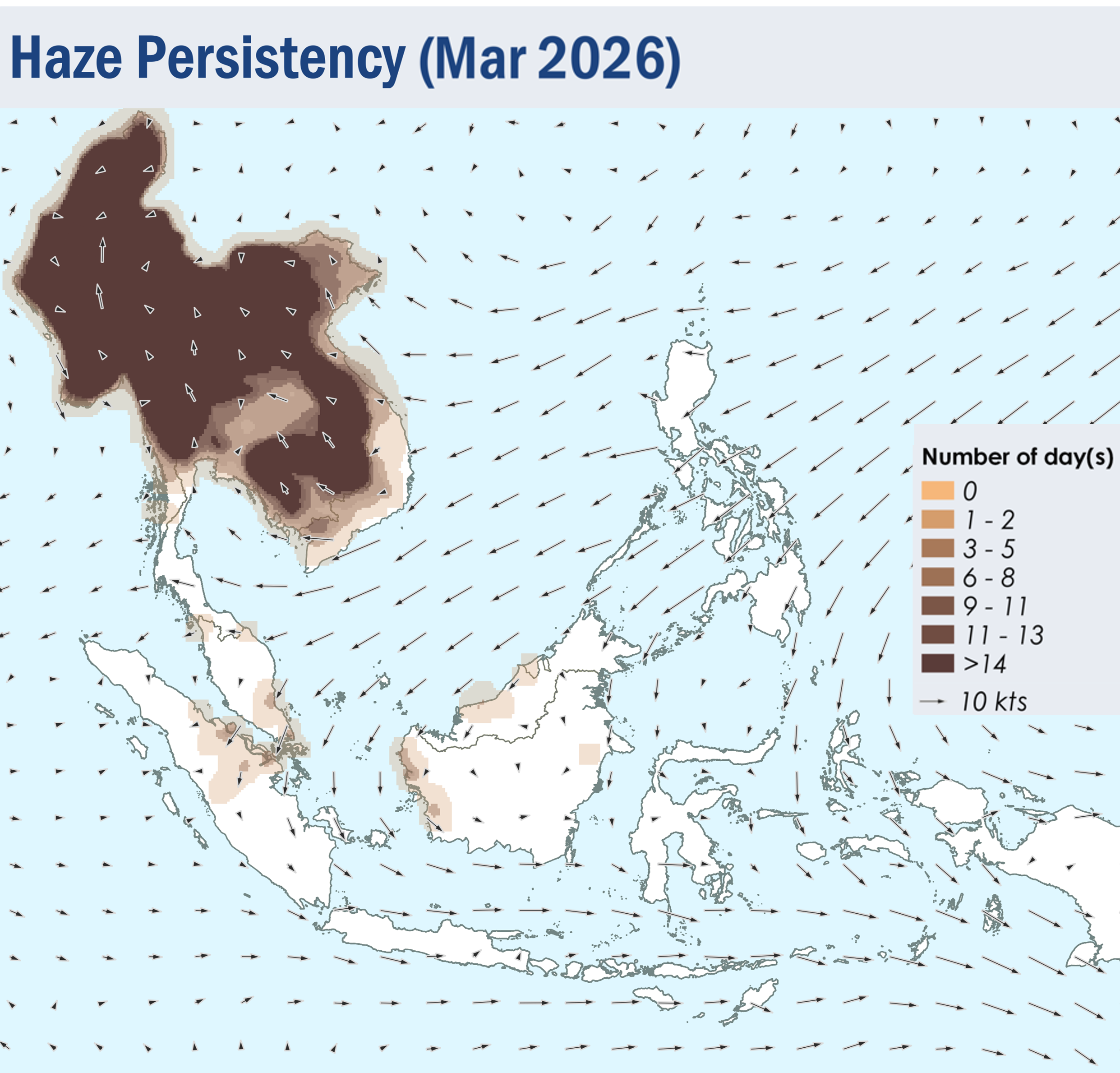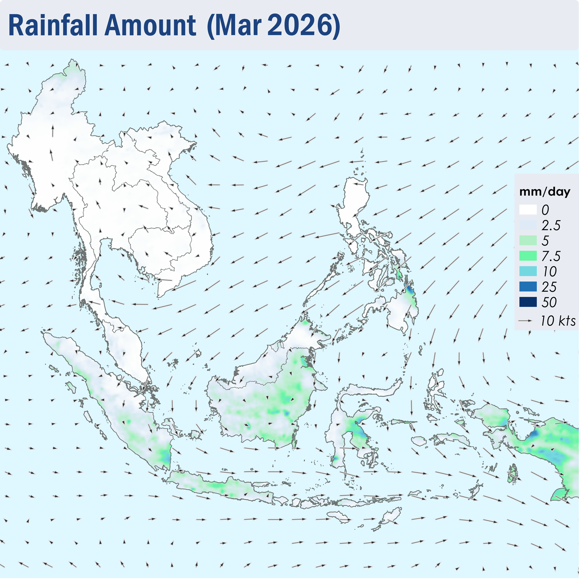 1.1 During March 2026, Northeast Monsoon conditions remained over the ASEAN region. Over regions north of the Equator, the prevailing low-level winds blew mainly from the northeast to east, except over the Mekong sub-region where the winds were generally weaker and blew mostly from the southeast or south (Figure 1). Over regions south of the Equator, the prevailing low-level winds blew from the west to north (Figure 1).