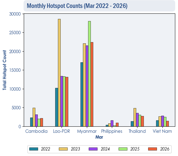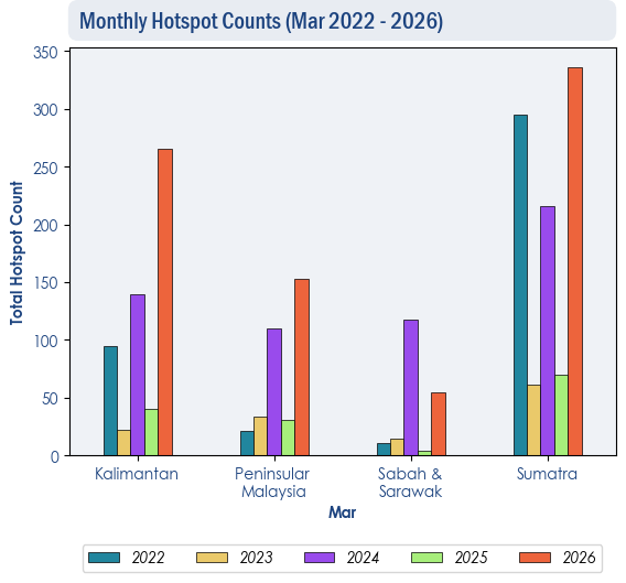 1.3 Over the northern ASEAN region, the hotspot counts for March 2026 were generally lower than or comparable to previous years (Figure 2). Over the southern ASEAN region, there was an increase in hotspot counts over Kalimantan, Peninsular Malaysia and Sumatra, with the highest count recorded in five years (Figure 3).