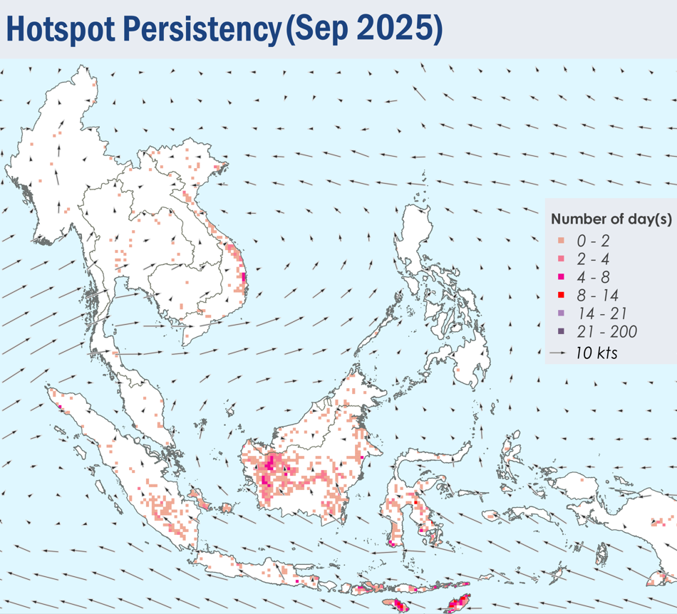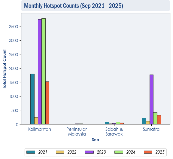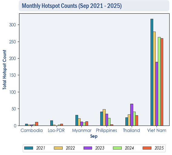 1.3 The hotspot counts for the ASEAN region in September 2025 were generally lower than or comparable to those recorded in the same month during previous years. (Figures 2 and 3).