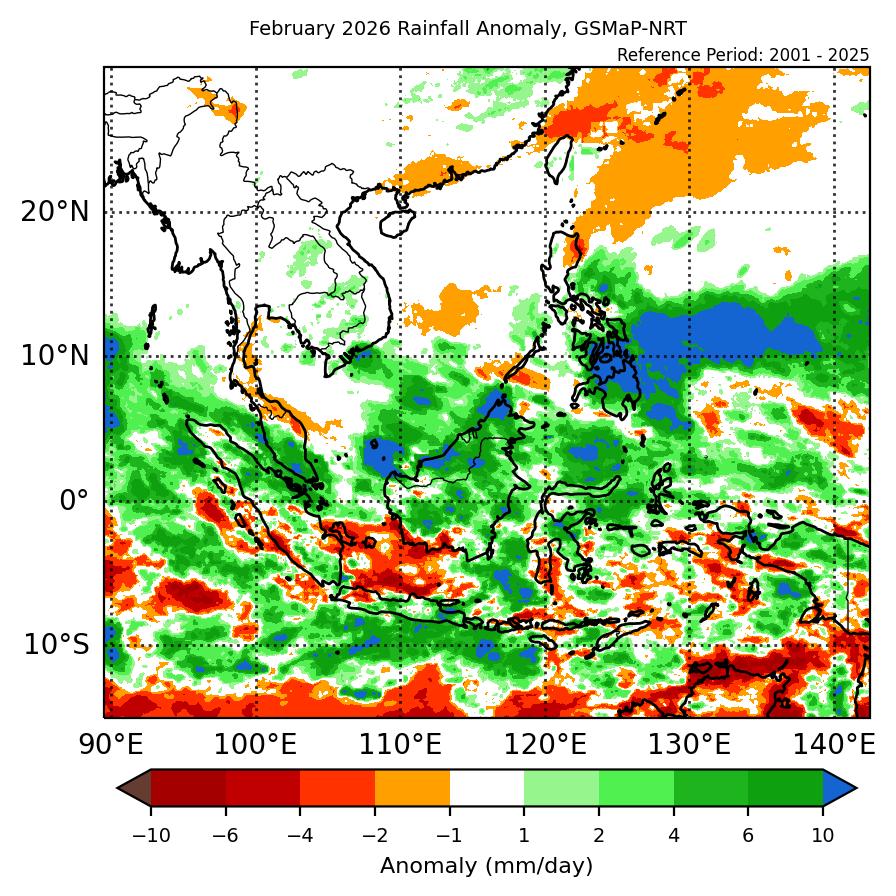 1.2 The observed rainfall anomaly pattern of above-average rainfall over the northeastern Maritime Continent, where the highest anomalies are recorded, is consistent with the predictions from the subseasonal weather outlooks for February 2025 (2 – 15 February 2026, and 16 Febraury – 1 March 2025). The subseasonal weather outlooks predicted a drier central Maritime Continent, which is more consistent with the recorded rainfall from CMORPH-BLD. The observations match the most likely tercile from the seasonal outlook for February 2026 for northeastern Maritime Continent where the rainfall observed the largest positive anomalies.