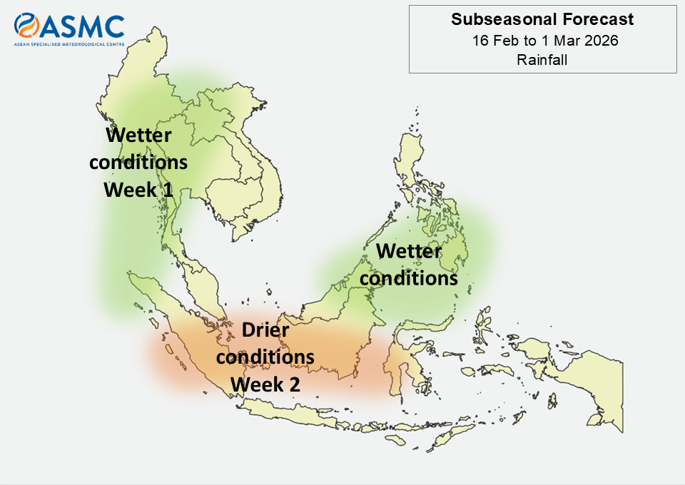 Wetter conditions are predicted over parts of western and central Mainland Southeast Asia as well as parts of the northwestern Maritime Continent in Week 1 (16 – 22 February). Wetter conditions are predicted over parts of the northeastern Maritime Continent in the next fortnight (16 February – 1 March).