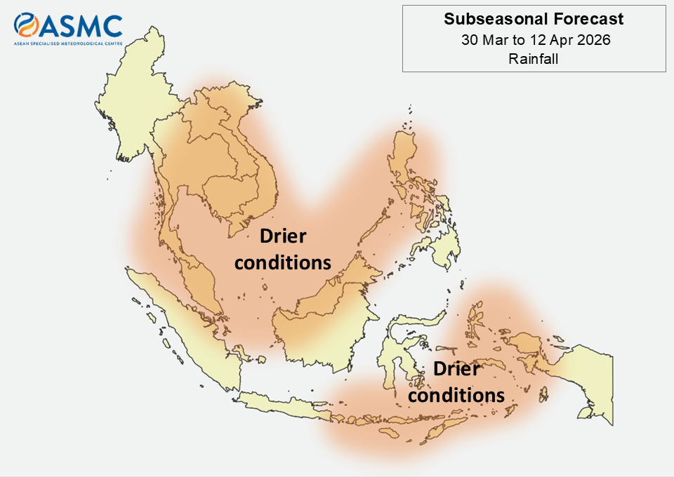 Drier than usual conditions are predicted over much of Mainland Southeast Asia and most of the northern and southeastern Maritime Continent during the next fortnight (30 March – 12 April).