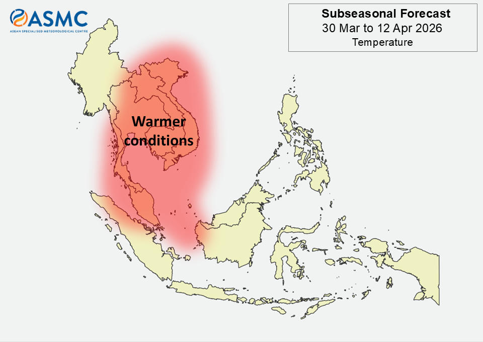 Warmer than usual temperatures are predicted over much of Mainland Southeast Asia and parts of the northwestern Maritime Continent during the next fortnight (30 March – 12 April).