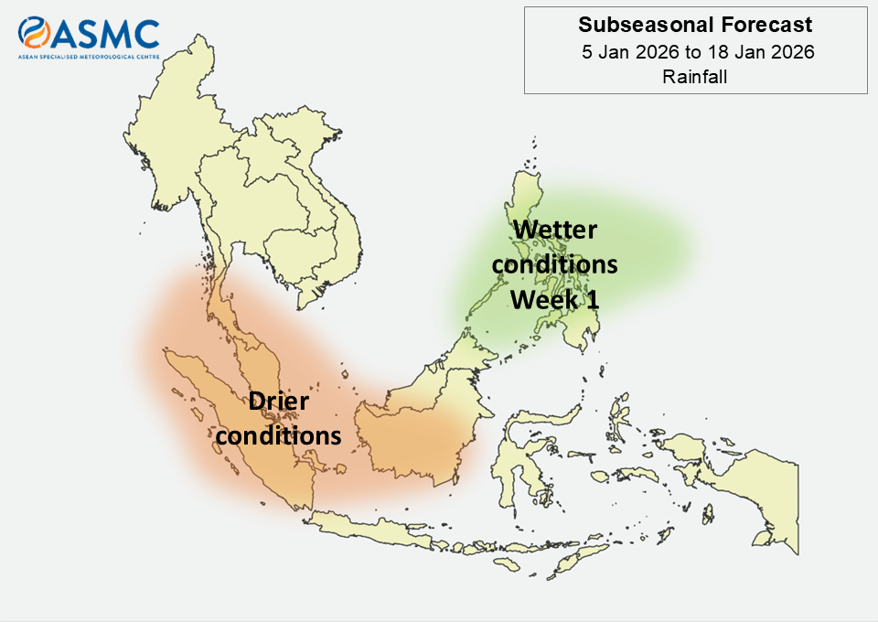 Wetter conditions are predicted over parts of the northeastern Maritime Continent in Week 1 (5 – 11 January).