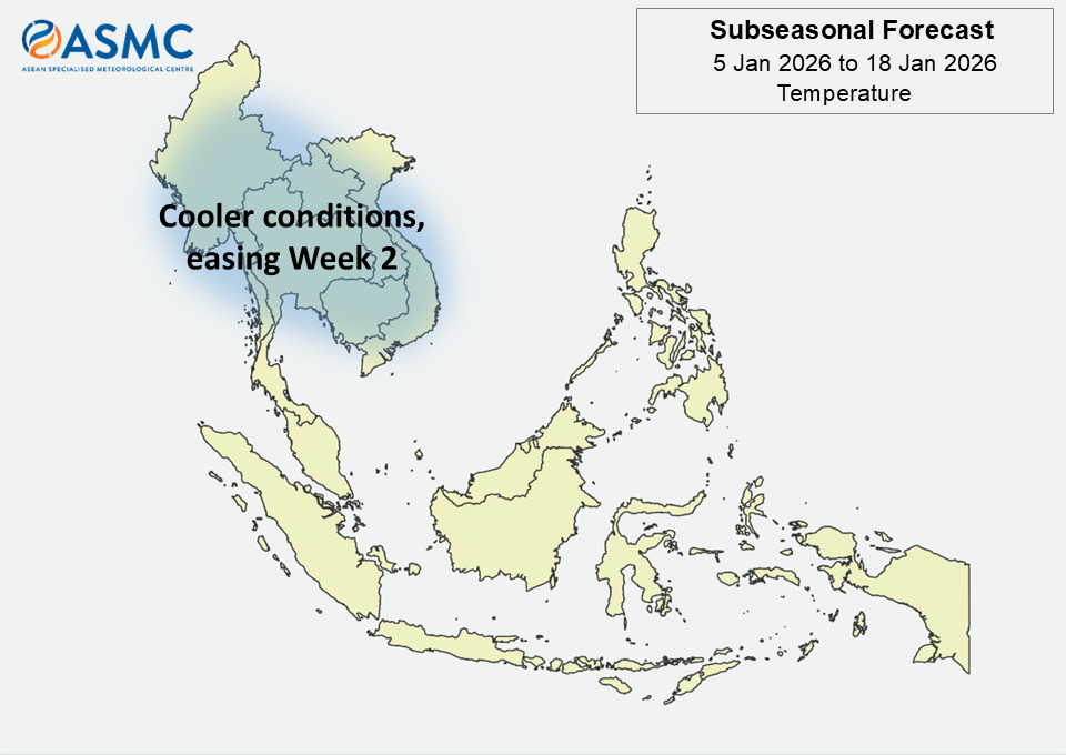 Cooler than usual temperatures are predicted for most of Mainland Southeast Asia in Week 1 (5 – 11 January). These cooler conditions are predicted to ease in Week 2 (12 – 18 January).