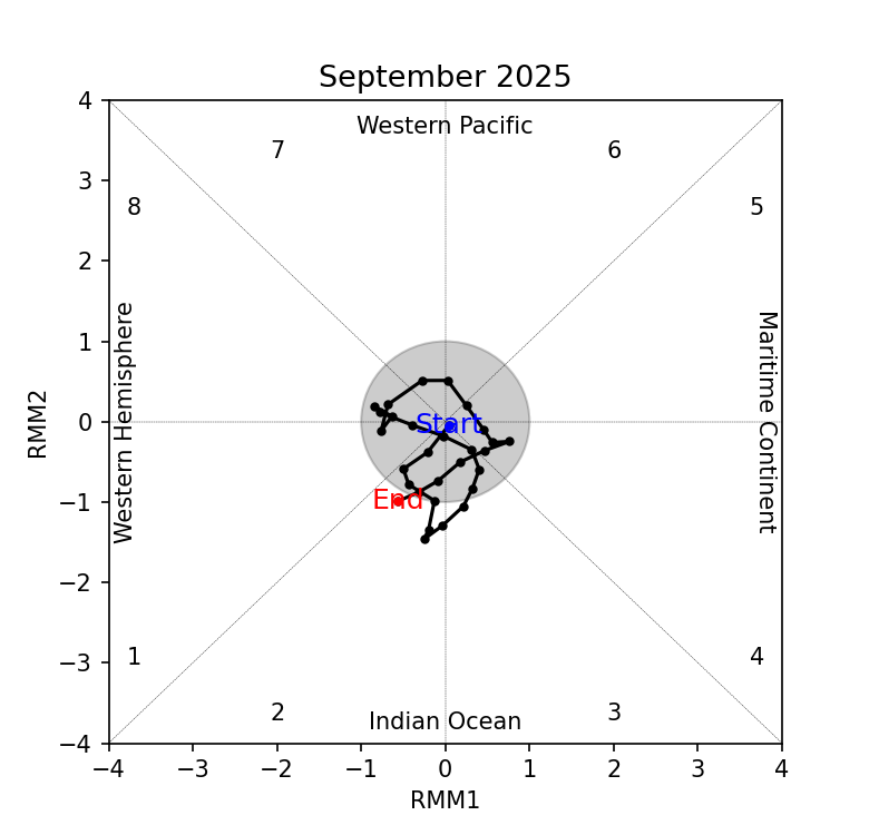 2.1 At the start of September, the Madden-Julian Oscillation (MJO) was inactive based on the RMM diagram (Figure 3). An MJO signal emerged over the Indian Ocean (Phases 2 and 3) towards the end of the first week of the month, before rapidly decaying in the middle of the second week and then remaining inactive until the end of the month. At this time of the year, Phases 2 and 3 tend to bring drier wetter conditions to the western Maritime Continent. However, these patterns are not visible in Figure 1, indicating other drivers likely had a stronger influence on the region’s rainfall.