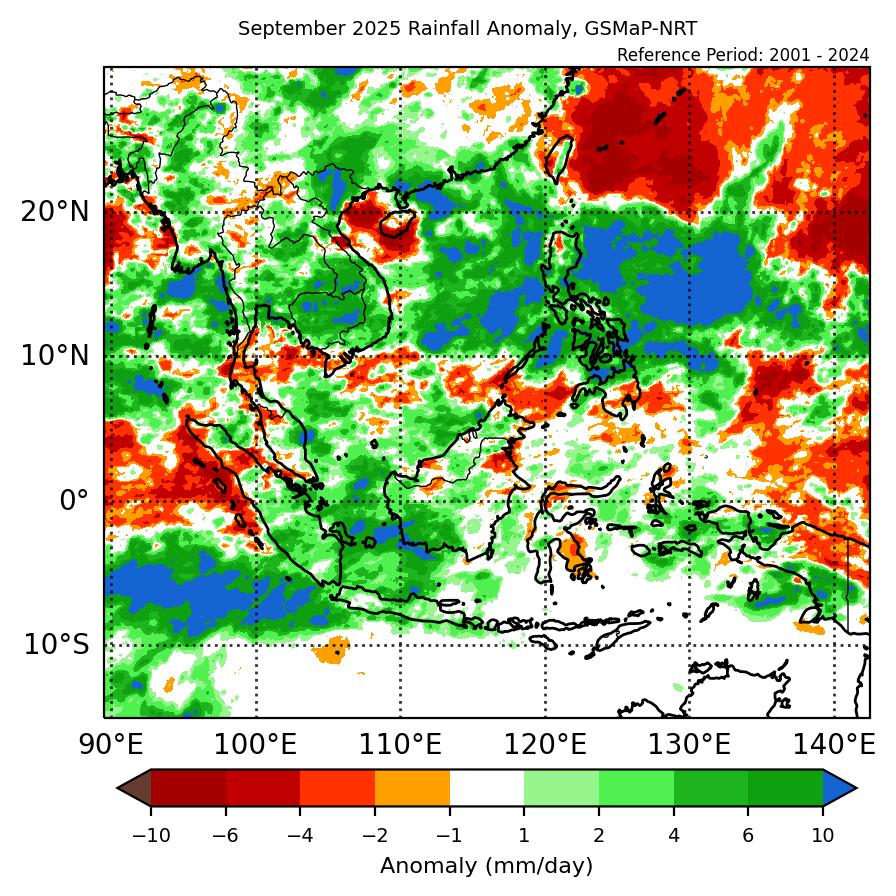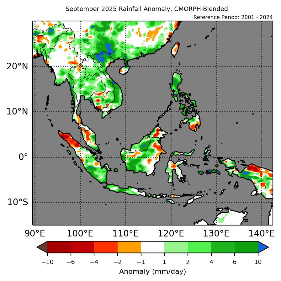 1.1 During September 2025, many parts of Southeast Asia experienced above-average rainfall (Figure 1). Most of the Maritime Continent recorded positive (wetter) anomalies in both datasets (GSMaP-NRT and CMORPH-Blended), although CMORH-Blended (Figure 1, right) recorded more extensive negative (drier) anomalies over the northwestern part of the region . Over Mainland Southeast Asia, positive anomalies were recorded over the eastern and central parts of the region. Over the western parts, the two datasets disagree, with GSMaP-NRT recorded mostly above-average rainfall while CMORPH-Blended recorded near-average rainfall over this region. The largest positive (wetter) anomalies over Southeast Asia were recorded over northeastern Mainland Southeast Asia and much of the Philippines.