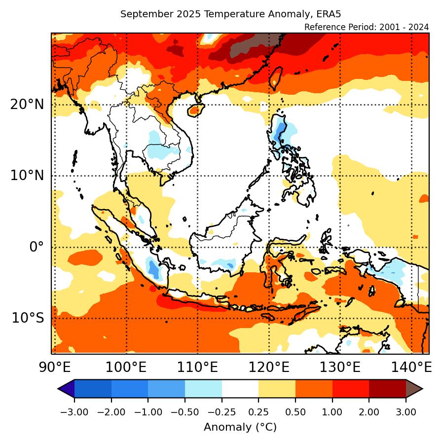 1.3 Near- to above-average temperatures were recorded over Mainland Southeast Asia in September 2025, while below- to above-average temperatures were recorded over the Maritime Continent (Figure 2). The coldest anomalies (0.5°C – 1°C below average) were recorded over southern Sumatra and northern Philippines, in line with the above-average rainfall anomalies. The warmest anomalies (0.5°C – 1°C above average) were recorded over parts of northeast and northwest Mainland Southeast Asia, as well as over Sulawesi.